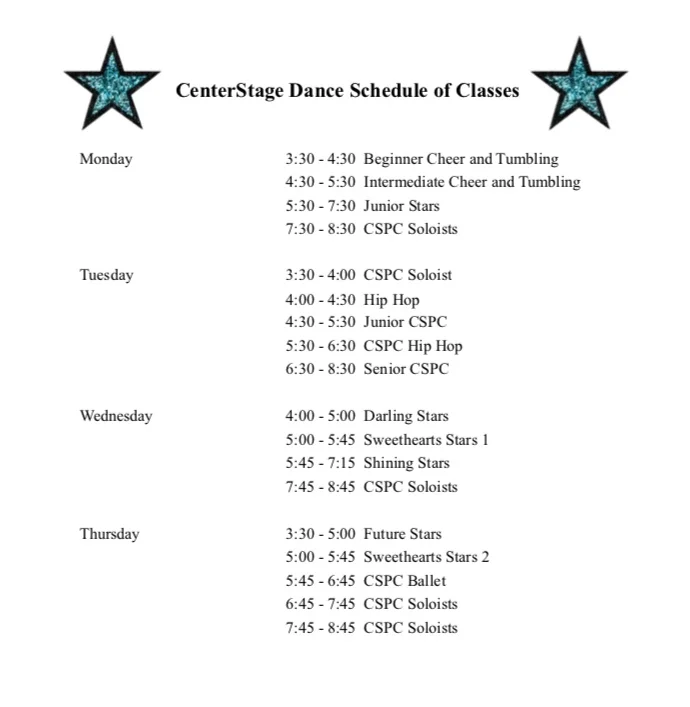 The CenterStage Performing Company (CSPC) attends class twice a week, once for rehearsal and once for technique class. The CSPC travels to different competition throughout and near Arkansas to compete against other studios.